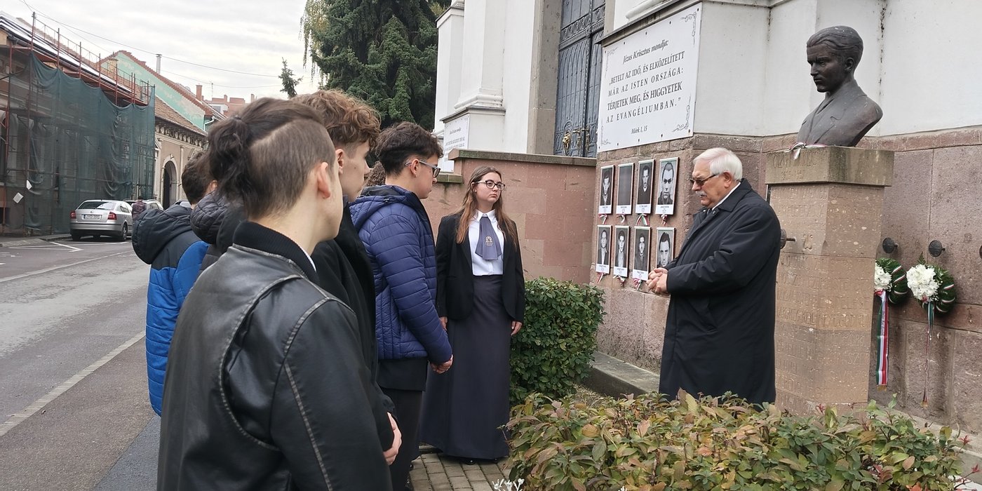 Október 22-én gimnáziumunk 9.C történelem tagozatos diákjai nagytiszteletű Szabó Sándor, a Lévay József Közművelődési Egyesület elnökének jelenlétében megkoszorúzták a Oláh Miklós szobrát és mártírtársai emléktábláját.