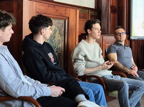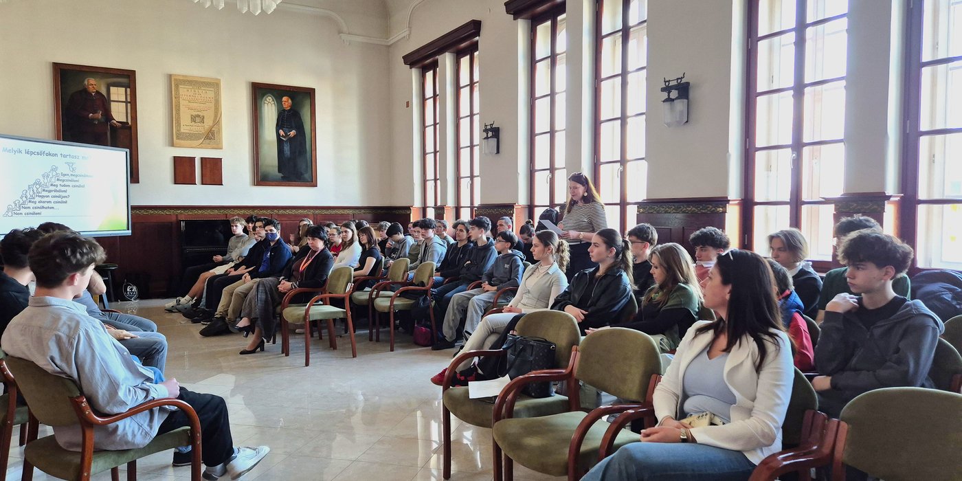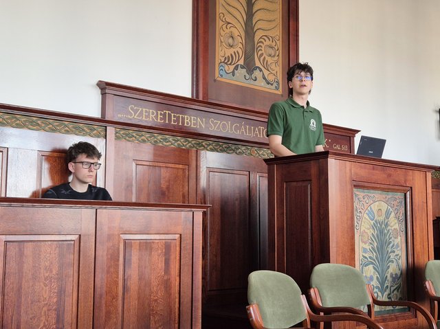 Végül Simon Előd, Stark Kolos, Bérczes Rudolf (11.A) és Király Keve (11.D) – a Károli Gáspár Református Egyetem Iustitia országos tanulmányi versenyének első helyezett csapata – a jogi gondolkodás és a csapatmunka jelentőségéről osztották meg tapasztalataikat. Rudolf és Keve előadta Katona József Bánk bánja tragikumára írt védő- és vádbeszédet.