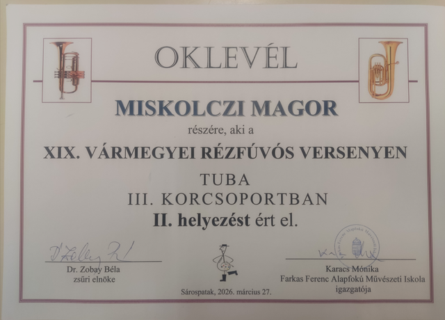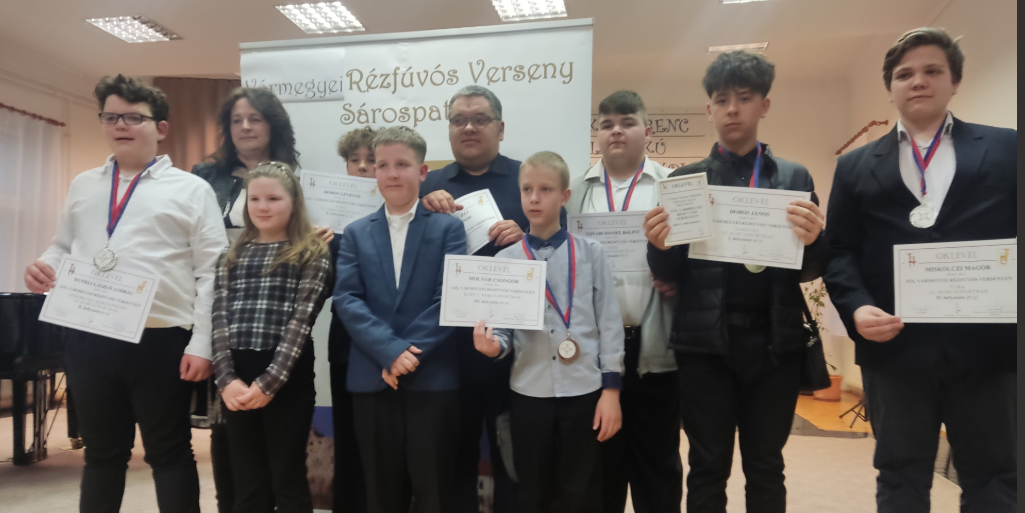 Örömmel osztjuk meg, hogy Miskolczi Magor 8. B osztályos tanulónk (a kép jobb szélén) a Sárospatakon rendezett XIX. Vármegyei Rézfúvós Versenyen tuba hangszeren 2. helyezést ért el!